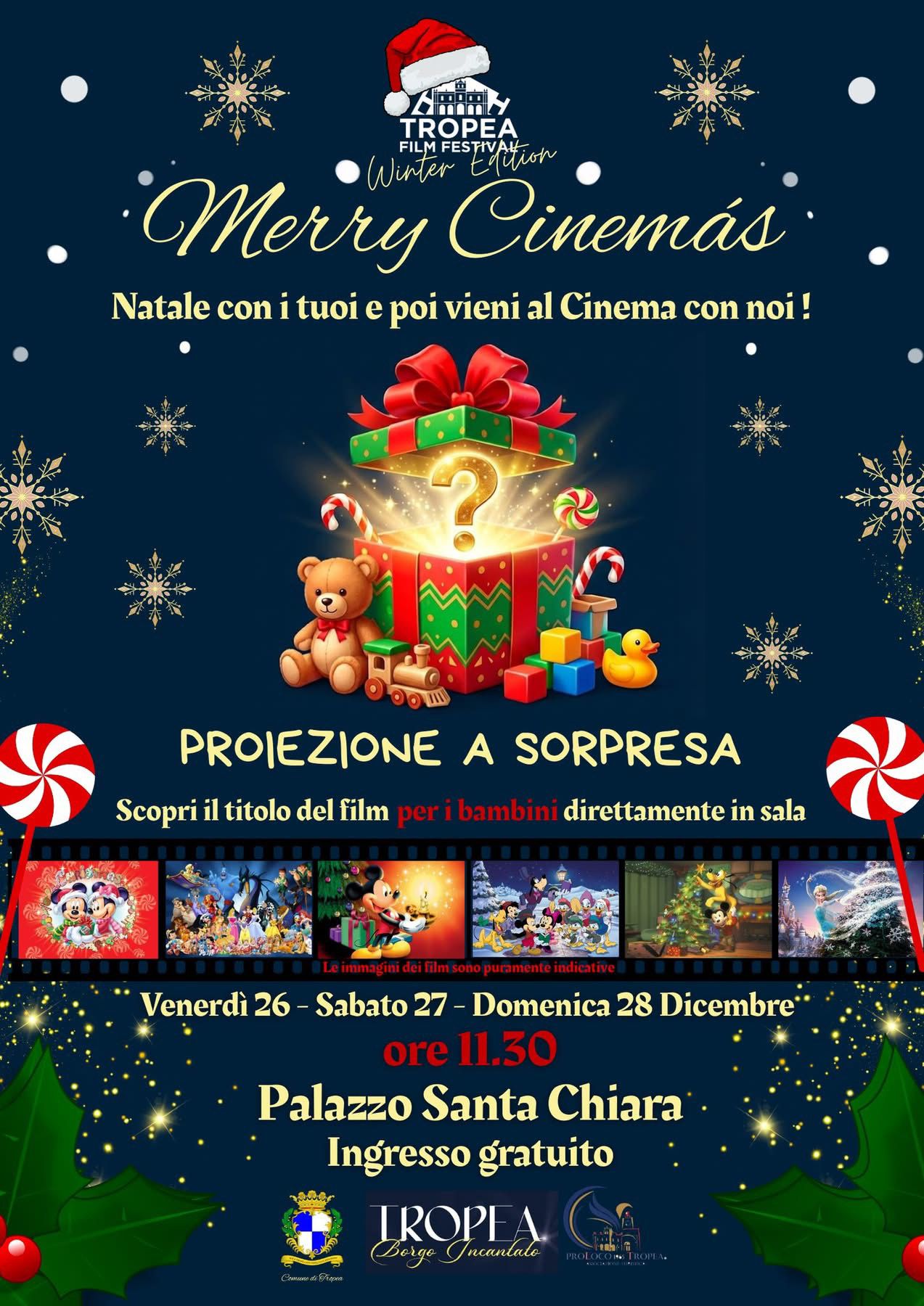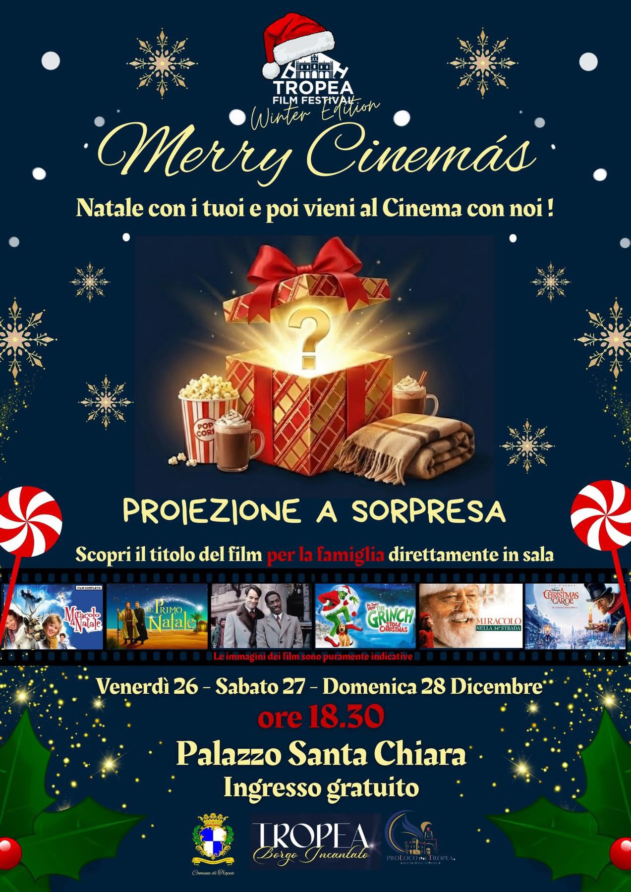 Il 26, 27 e 28 dicembre e il 2 3 e 4 gennaio Palazzo Santa Chiara diventerà la nostra sala cinematografica.