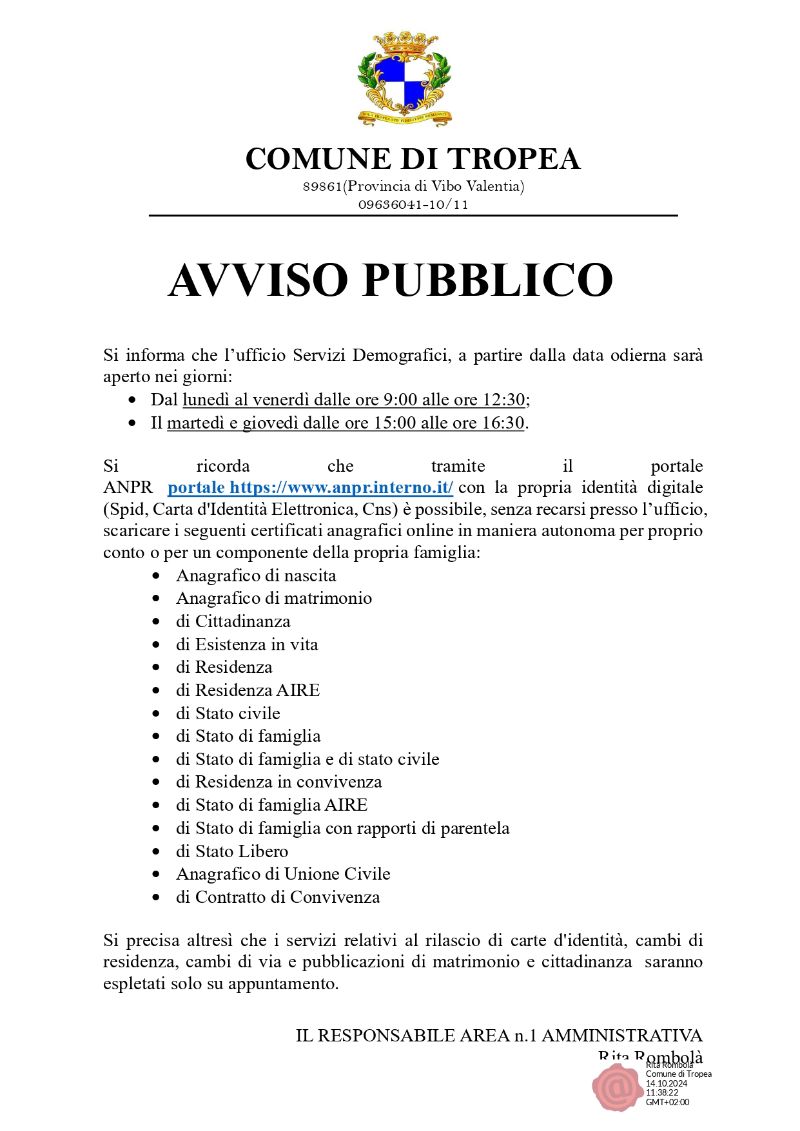 Si informa che l’ufficio Servizi Demografici, a partire dalla data odierna sarà aperto nei giorni: Dal lunedì al venerdì dalle ore 9:00 alle ore 12:30; Il martedì e giovedì dalle ore 15:00 alle ore 16:30.