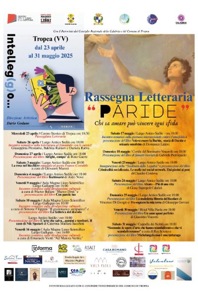 Iniziativa culturale "Paride" Maggio dei Libri 2025, rassegna letteraria con un ciclo di quindici presentazioni di autori nel centro storico di Tropea, organizzata in occasione del "Maggio dei Libri" 2025, che avrà luogo dal 23 Aprile al 31 Maggio.